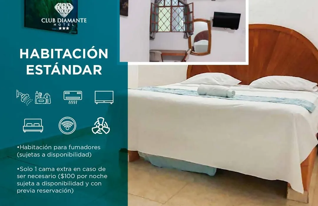 Este alojamiento cuenta con habitaciones con un minibar, TV de pantalla plana con canales vía satélite y climatizador. El Hotel Club Diamante ofrece cuartos de baño equipados con una ducha, toallas y artículos de tocador para huéspedes.